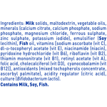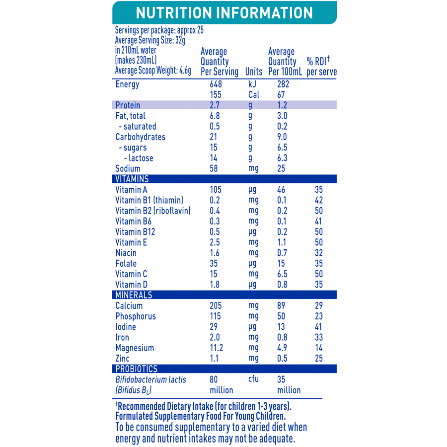 Milk solids, maltodextrin, vegetable oils, minerals (calcium citrate, calcium phosphate, sodium phosphate, magnesium chloride, ferrous sulphate, zinc sulphate, potassium iodide), emulsifier (Soy lecithin), Fish oil, vitamins [sodium ascorbate (vit C), dl-alpha-tocopheryl acetate (vit E), niacinamide (niacin), pyridoxine hydrochloride (vit B6), riboflavin (vit B2), thiamin mononitrate (vit B1), retinyl acetate (vit A), folic acid, cholecalciferol (vit D3), cyanocobalamin (vit B12)], antioxidants (mixed tocopherols concentrate, ascorbyl palmitate), acidity regulator (citric acid), culture (Bifidobacterium lactis).L: One of the most well researched probiotic strains in paediatric nutrition
