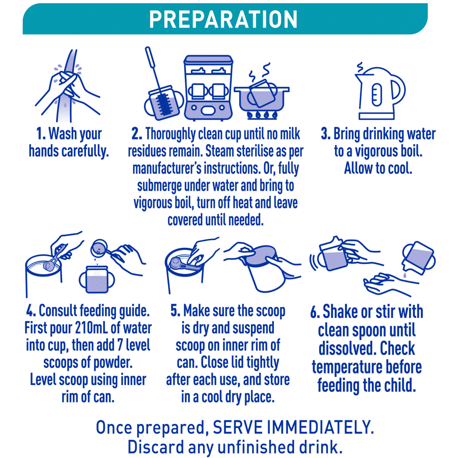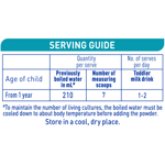 - Consult serving guide. First, pour 210mL of water into cup, then add 7 level scoops of toddler milk drink powder. Level scoop using inner rim of can.